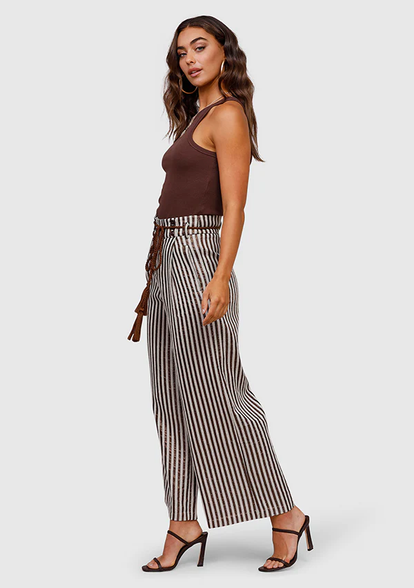 The Fleetwood Stripe Pants will bring a folkloric mood to evening dressing. They?re crafted from a metallic stripe patterned fabric to a flattering high-rise wide-leg silhouette and accented with a rope tie at the waist. Complement them with a simplistic top and tuck it in with some ankle boots.