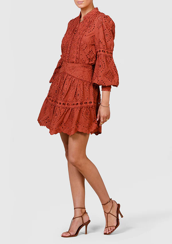 The Nouveau Embroidery Mini Skirt, lends a romantic bohemian edge to the dreamy nuances. Adorned with an elegant broderie anglaise pattern, delicate details and floral embroidery it highlights the artisanal craftsmanship. Wear this elevated essential with the matching blouse to heighten the bohemian aesthetic.