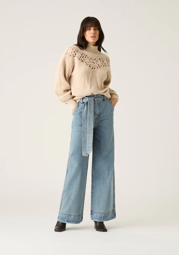 A MOS essential for the chilly winter days, the Piper Knit Jumper features a high ribbed collar with contrast knit rib cuffs and hem, and a crochet V panel. Pair with Harper Denim Maxi skirt and boots or sneakers for an elevated take on cosy winter dressing.