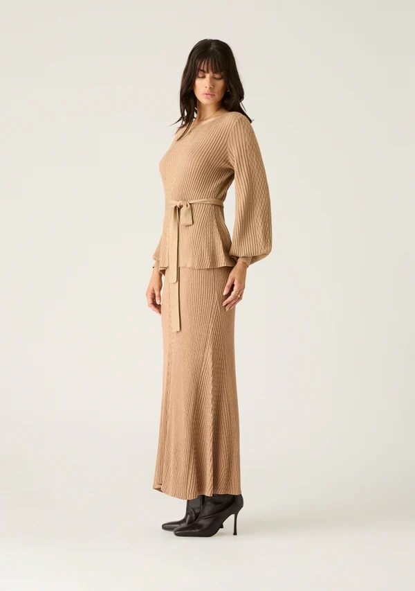 A modern twist on the classic knit top, the MOS Scarlet Knit Top in metallic gold features a wide scoop neck that can be styled as off-shoulder, blouson sleeve, and self tie fabric belt. The Scarlet Knit Top can be worn as a set with our Scarlet Maxi Skirt or on its own with jeans and heels for the perfect winter night out.