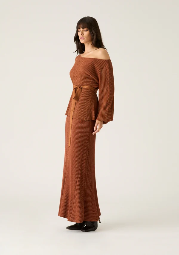 A modern twist on the classic knit top, the MOS Scarlet Knit Top in metallic rust features a wide scoop neck that can be styled as off-shoulder, blouson sleeve, and self tie fabric belt. The Scarlet Knit Top can be worn as a set with our Scarlet Maxi Skirt or on its own with jeans and heels for the perfect winter night out.