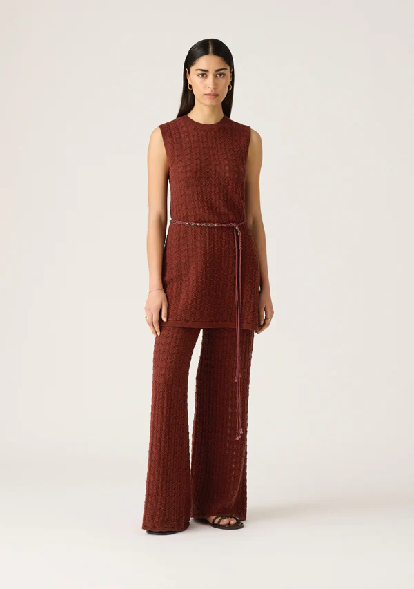 -Wide leg knit pants in an earthy, rich wine colouring