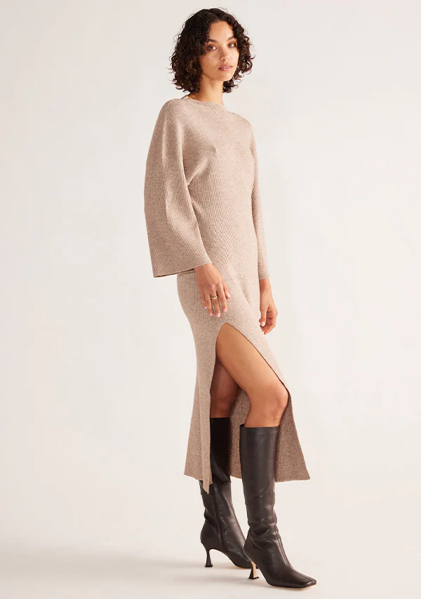 A soft and luxurious Midi Dress that will hero your trans-seasonal winter wardrobe this season. Featuring turtleneck, tight high side split, and a slip on, body hugging fit ~ this long sleeve dress works as both a base layer or stand-alone style for an elevated yet relaxed look. Pair the Wistful Turtleneck Midi Dress with heeled boots for work to bar ease, or with sneakers or sandals for the weekend.